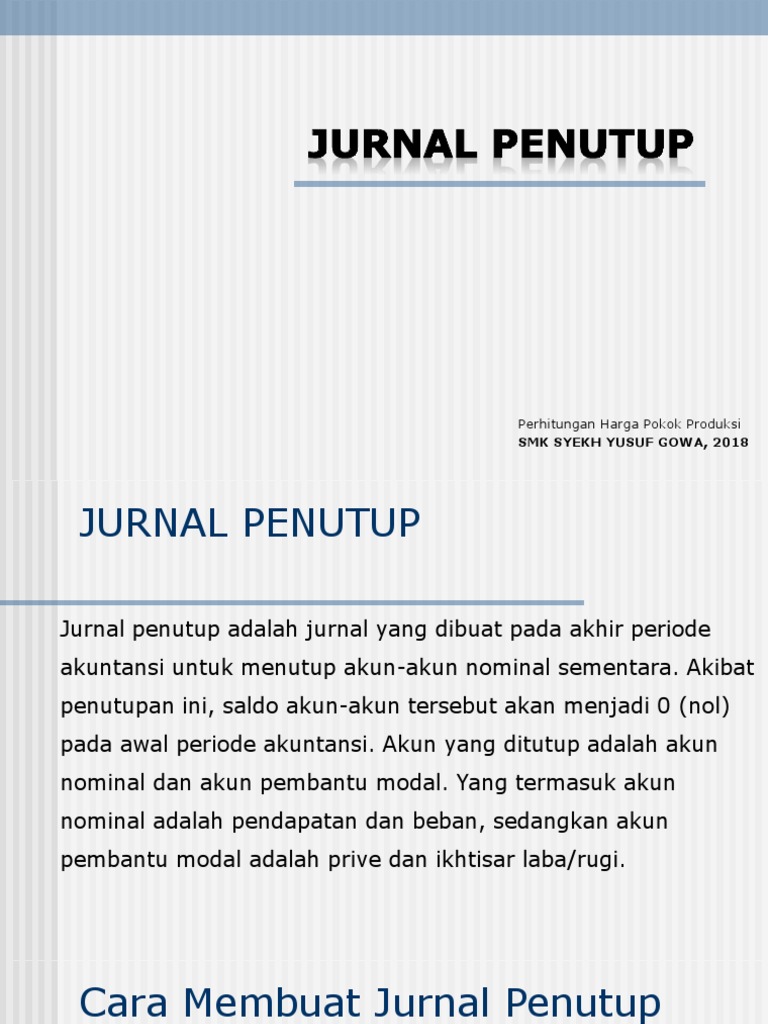 Posting terkait jurnal penutup (closing entries) merupakan salah satu bentuk jurnal yang dibuat setiap akhir periode akuntansi dengan sebuah tujuan untuk. Jurnal penutup adalah pemindahan saldo akun pendapatan dan beban yang merupakan akun nominal, ke akun modal dengan ikhtisar laba/rugi dan pemindahan saldo akun prive ke akun modal. Jurnal penutup merupakan salah satu bagian dari laporan keuangan yang akan disusun pada akhir periode pembukuan. Semoga artikel ilustrasi soal jurnal penyesuaian pendekatan hpp pada perusahaan dagang ini dapat meningkatkan pemahaman anda dalam. Video ini menayangkan cara membuat jurnal penyesuaian dengan metode hpp pada perusahaan dagang secara lengkap langkah demi langkah.perlu anda ketahui bahwa.